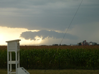 Základna Cumulonimbu s doprovodnými oblaky - Pokud se bouřkový oblak přiblíží blíže k místu pozorování, můžeme sledovat děj pod jeho základnou, resp. čelo bouře. Ještě před srážkami bývá někdy viditelný doprovodný oblak arcus (Cb arc) nazývaný také húlavový límec (i když během jeho přechodu nemusí být splněny podmínky húlavy se silným nárazem větru) čili Shelf cloud. Jiný doprovodný oblak pod základnou bouřkového oblaku je tzv. Rotor cloud. Rotorový oblak, jak už název napovídá, rotuje horizontálně pod základnou Cumulonimbu, který jej valí rychle před sebou. Dalším doprovodným oblakem může být pannus (Cb pan), který má podobu roztrhaných oblaků pod základnou Cumulonimbu. Tyto oblaky mohou různě zanikat a vznikat a zdánlivě se pohybovat rychleji než samotný Cb. Zvláštností bouřkového mraku může být i mamma (Cb mam), výčnělky pod kovadlinou, které po odchodu bouře naznačují rozpad Cumulonimbu, nicméně pokud se mamma tvoří již na vznikajícím Cb, může to značit silnou bouřku. K bouřkovým oblakům patří pochopitelně i srážky (přeháňka dešťová i sněhová, kroupy, krupky atd.), které mají vzhled šedé clony a říká se jim také srážkové pruhy. Když srážky dopadají až na zemský povrch hovoříme o praecipitatio (Cb pra), pokud však na zem nedopadají, pouze z oblaku visí směrem dolů, je to virga (Cb vir).